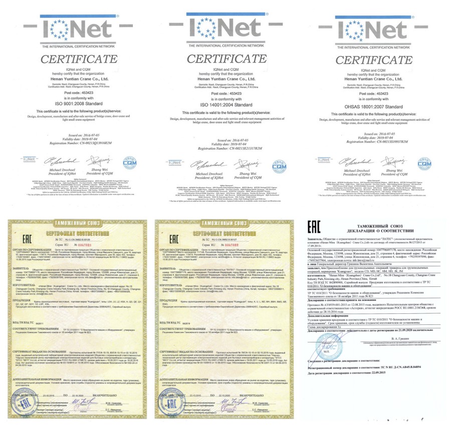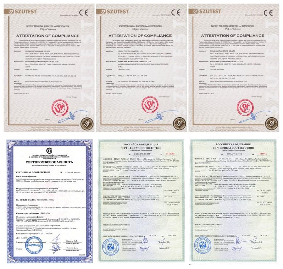 Peb crane tau dhau CE, ISO, GOST, SGS, TUV, BV, thiab ntxiv rau.